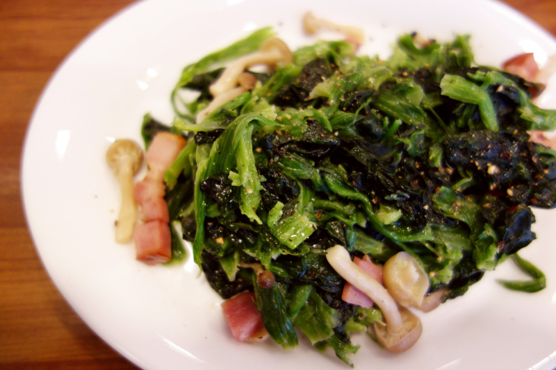 ほうれんそうがしんなりしてきたら、コーンやベーコンと醤油、塩・胡椒をいれて味付けして完成。