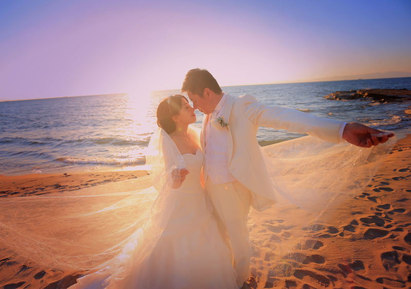 スタジオを抜け出してより自由に、お二人らしい写真を残しましょう。こちらは名古屋近郊の海に行くプランです☆