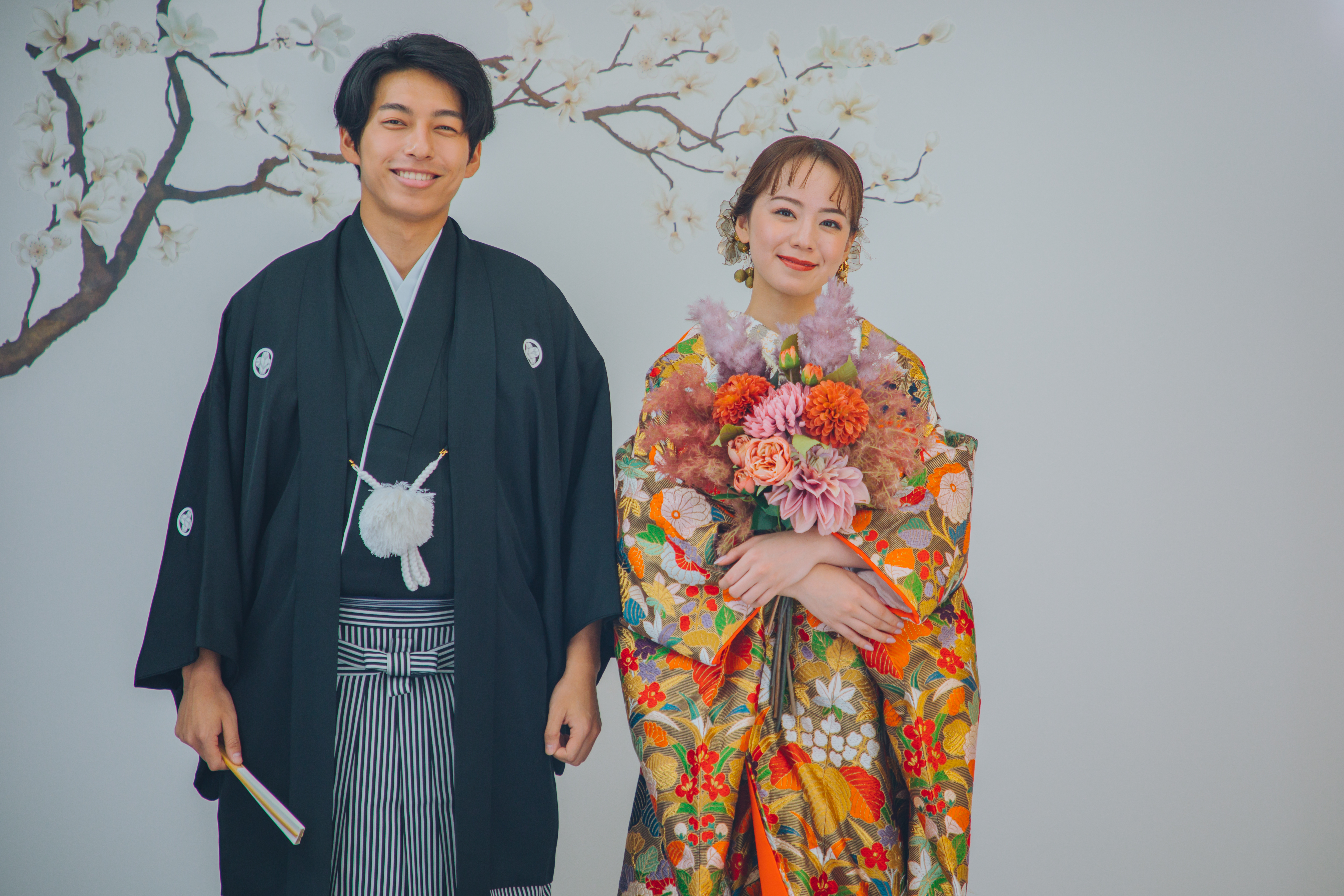 新婦和装衣裳2着(色打掛・白無垢)新郎衣裳1着にヘアメイク、撮影全データが付いた嬉しいスタジオ撮影プランです。
