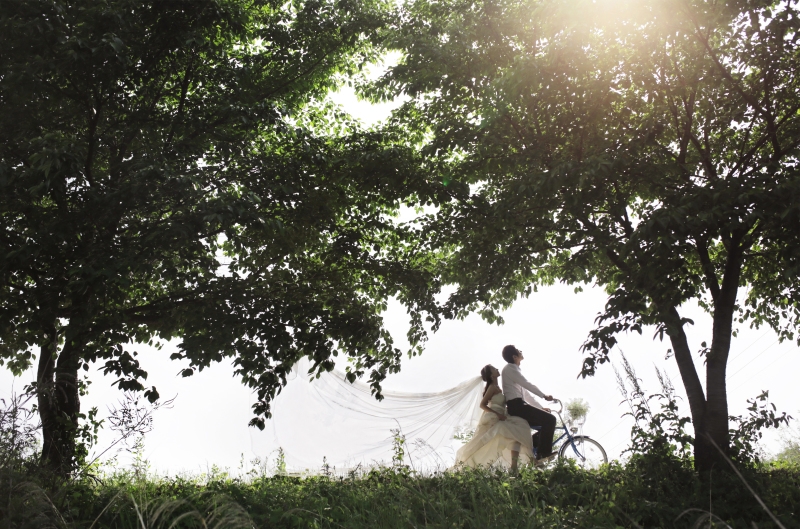 韓国では自転車を使ったロケーションフォトに注目が集まっていることをご存知でしょうか。新郎が運転する自転車の後部座席に新婦が乗って撮影するスタイルが一般的ですが、新婦が後ろを向いて乗ったり、あえて遠方から撮影するスタイルなどがあり撮影を楽しむことができます。野原や森林など自然がいっぱいのスポットで撮影するとほのぼの感が出て、仲睦ましい雰囲気を出すことができますよ。ちょっとレトロタイプの自転車を選ぶとおしゃれです。