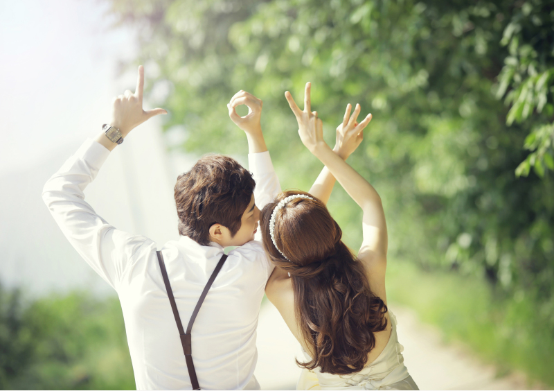 新郎新婦で指文字をつくるウェディングフォトも、韓国では人気があります。画像では、二人で「LOVE」の文字をつくっていることがわかりますね。もちろんスタジオでもチャレンジすることができますが、色とりどりの自然のなかで試してみると指文字が映えてきれいにきまりますよ。指文字を強調するために、新郎新婦は後ろ向きになって撮影してみてもいいでしょう。少し後ろを向くかのようにポージングを撮ると、ニュアンスが出ます。