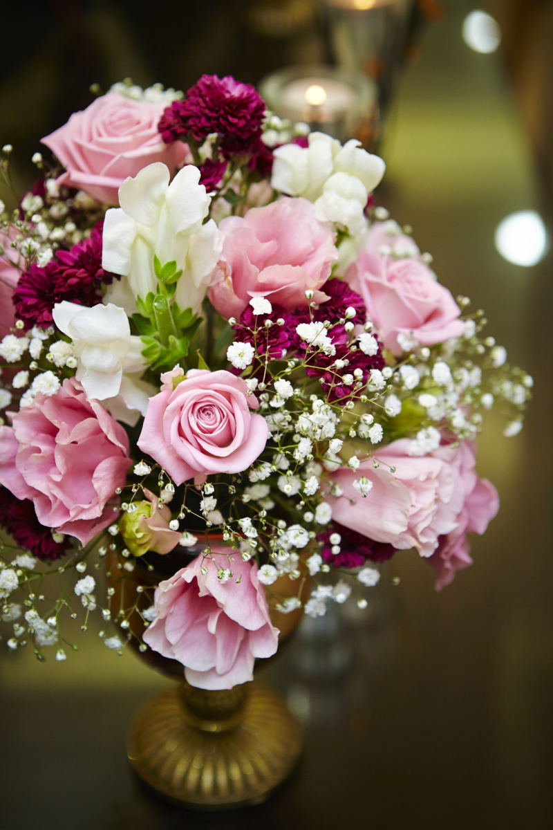 バランスを考えて、背の高い人は大きめに、背の低い人は小さめにするとよいでしょう。生花のブーケは、給水スポンジのついたブーケホルダーに花を挿したタイプも多いので、式の後もしばらく飾って楽しめます。