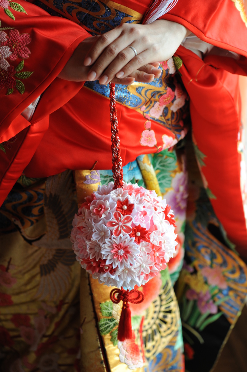 和装ウェディングにおすすめなのが、ボールブーケ。手毬のような丸いボール型のブーケに手で持つための組み紐などがついているタイプで、手で下げて持つのが特徴です。あでやかな和服に合う、赤や紫色を使った和テイストのブーケが多く、和装をかわいらしく演出するのにぴったり。和装だけどブーケも持ちたい!という人に選ばれるブーケです。