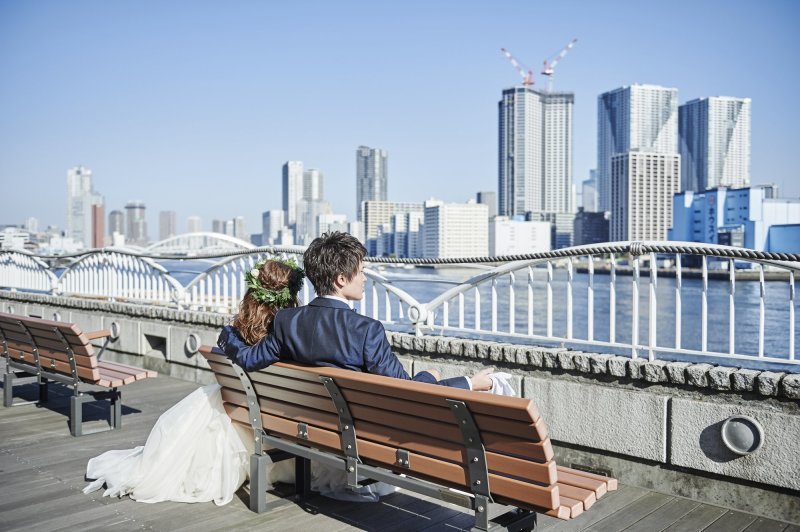 スカイツリーも完成し多くの観光客の集まる東京の下町ですが、こんなのどかな場所も。都会の喧騒を忘れてのんびりと過ごすことができます。高層ビル群と大きな隅田川が入った構図がおしゃれなフォトウエディング。