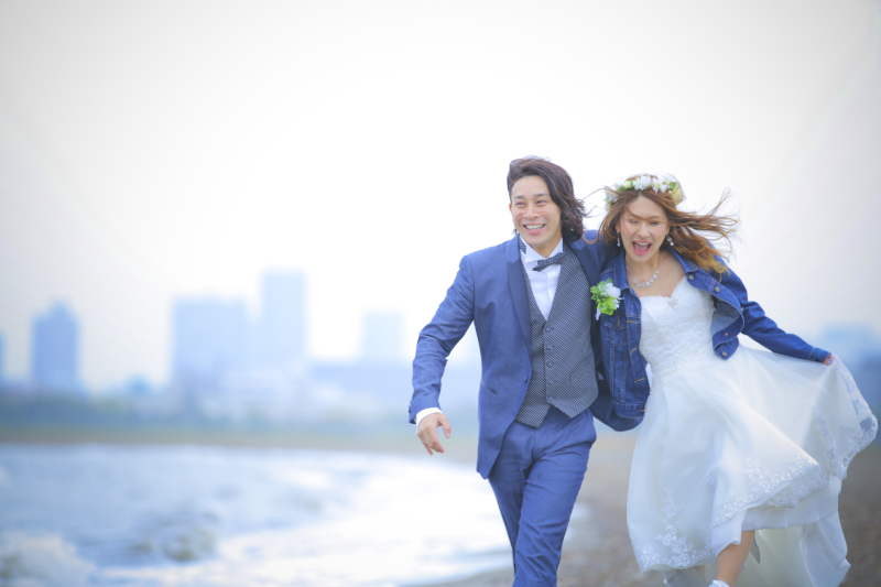 お台場海浜公園は砂浜もあるので、都会の真ん中で海水浴もできる場所。ここでのビーチウエディングフォトはおすすめです。後ろに見える高層ビル群が東京らしさを演出してくれますね!アクティブなフォトウエディングです。