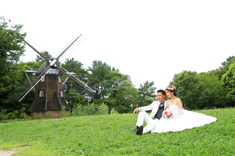 名古屋市北区にある名城公園のフラワープラザは、オランダ風車をバックにした撮影ができるスポットです。風車の周りには季節の花々が植えらており、洋装ウエディングにはぴったりのロケーション。桜の名所としてもよく知られています。