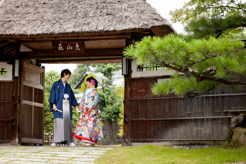 名古屋市瑞穂区ある東山荘は、枯山水の庭園や茶室が美しいフォトウエディングスポットです。東山荘の入り口にある茅葺の門はノルタルジックな雰囲気が魅力のスポット。ムードたっぷりの写真を撮ることができます。