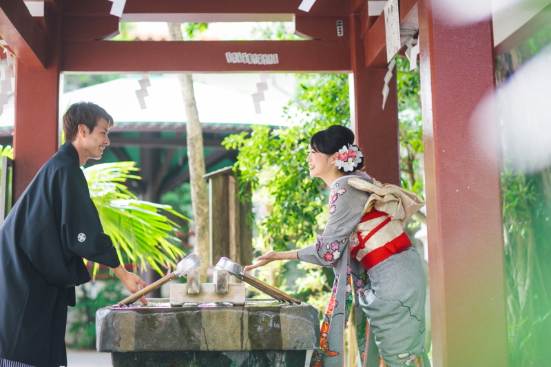 沖縄県那覇市に鎮座する8つの神社のうちのひとつである「波上宮」は、沖縄県らしい朱の鳥居が印象的な神社で。民族衣装を着るとロケーションによく馴染みます。海や空との写真以外にも沖縄らしい思い出を残しておきたいというカップルにおすすめのスポットです。結婚式を挙げることもできます。
