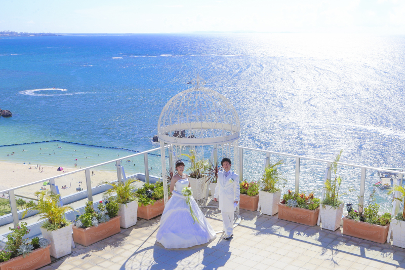 「恋人の聖地」サテライトに選ばれた「ビーチサイドスカイチャペルオキナワ」は本島中部にある結婚式場です。高台にある空中庭園からは沖縄の雄大な景色を臨むことができるため、フォトウェディングにはぴったりのロケーション。亜熱帯の花々に囲まれたスカイガーデンやプールサイドもフォトジェニックで、記念に残る写真を撮ることができるでしょう。