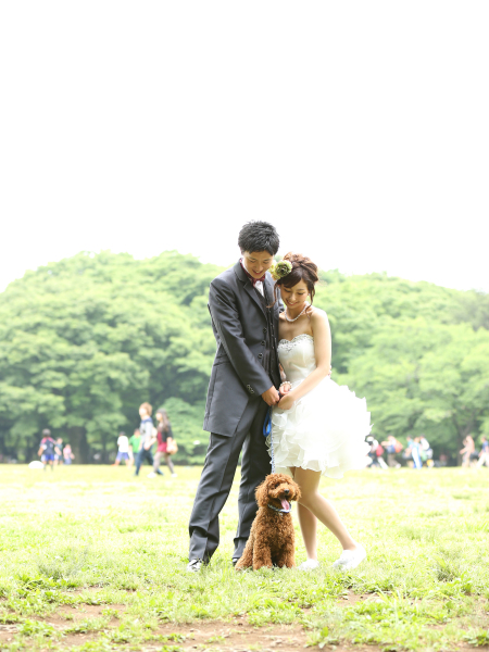 普段、二人がなにげなく日常でやっていることをあえて、ウエディング衣装で写真に残すのもいいですね!こちらは、愛犬のお散歩のワンシーンを残したものですが、ほのぼのとした一枚ですね!とても自然なポーズです。