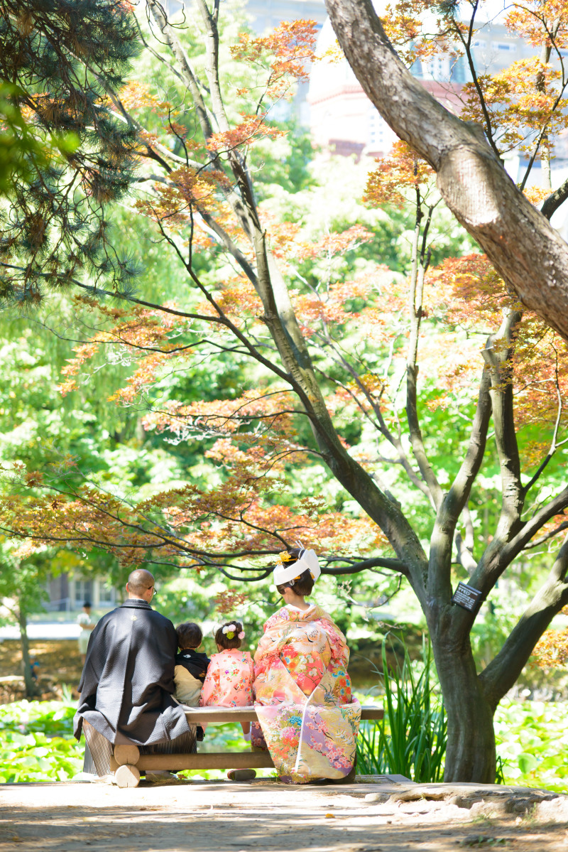 きれいな紅葉と緑の中、木漏れ日も差すロケーションで、みんなで和装を着て家族写真。ご家族でどんなお話をされているんでしょうね。とても可愛らしいお写真です。
