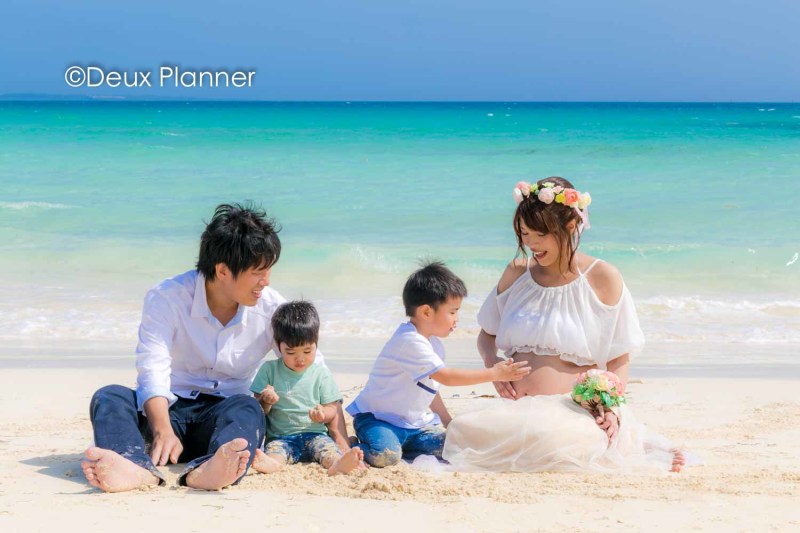 青い空、白い砂浜という素敵なロケーションでの家族集合写真。ママのお腹にはもう一人の大切な家族がいるなんて、とても印象に残る一枚ですね!