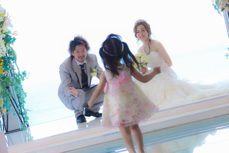 おいで!といつものお子様を呼ぶときのしぐさもウエディング衣装を身にまとっていると、とてもロマンティックに。そこに髪をなびかせて嬉しそうに駆け寄るお子様の姿は、ご両親にとっては目に入れても痛くないほどでしょうね。家族の愛を感じられる素敵な家族写真です。