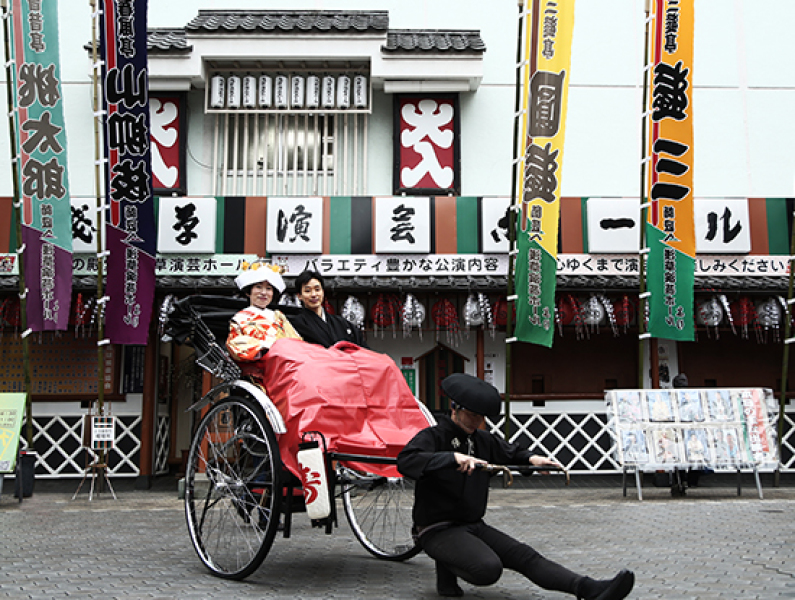 浅草演芸ホールは、毎年、年末年始にTV放映される寄席です。ここは通称「六区」といい、かつて浅草一の繁華街でした。今は、ドンキホーテや、全国のアンテナショップ「まるごとにっぽん」があり、大道芸も見られます。浅草の中でも広い通りなので、人力車プランがおすすめ!街の賑やかさもプラスされ二人の楽しい写真が撮れますよ。