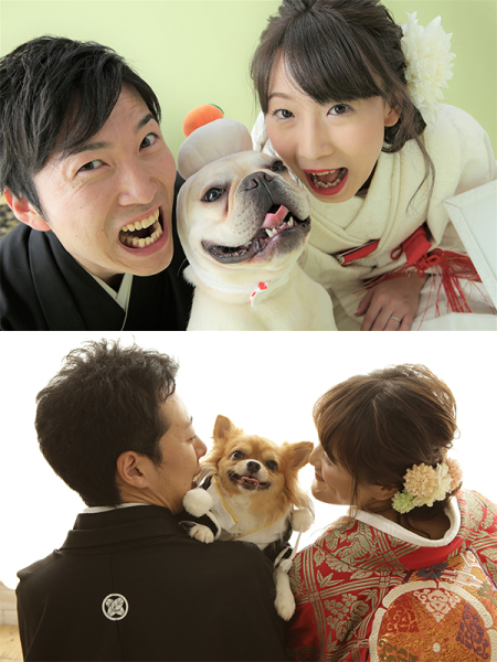 ペットと一緒ならリラックスしたとびっきりの笑顔になれるはず。抱っこしての撮影がNGというスタジオもありますが「クレールブライダルスタジオ」ではペットと一緒の写真もOK!年賀状用写真にもおすすめです。