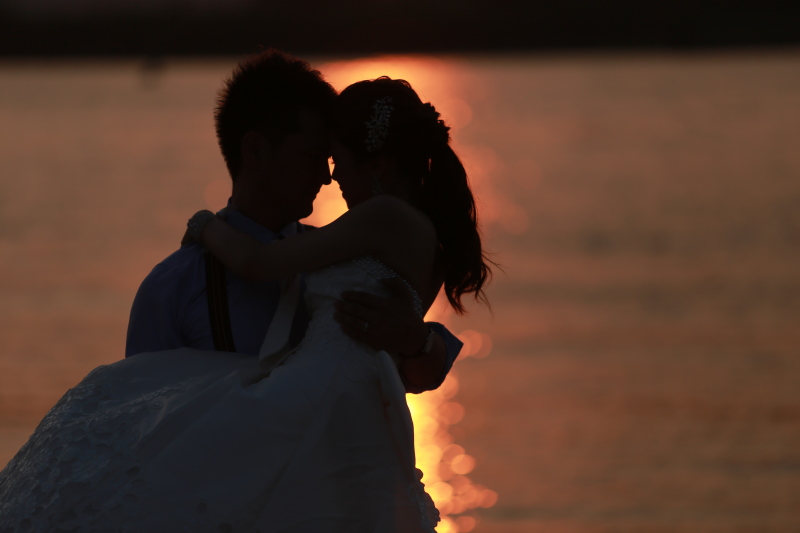 フォトウエディングでもはや定番になったビーチフォト。その中でも限られた時間でしか撮影出来ない貴重なサンセットに注目!打ち寄せる波打ち際に浮かび上がるふたりの幻想的なシルエット。自然と顔を寄せ合い、ロマンチック過ぎる一枚が残せます。