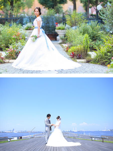 ただし、選ぶロケーションによって映えるドレスは変わります。例えば「クレールブライダルスタジオみなとみらい店」で人気の大桟橋には、ロケーションの開放感、スケール感に見合うロングトレーンがベストマッチ。横向きのショットでトレーンを目立たせると美しく仕上がります。夜景フォトの場合は存在感のあるシルエットを重視して、トレーンやベールの長いもの、ボリューミーなものがおすすめ。自分がその場に立つ絵をイメージしつつ、過去の撮影サンプルも参考にドレスを選んでみて。