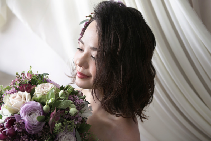 たとえば、トップにボリュームを出す、ふわふわしたゆるウェーブを足す、サイドの編み込みを目立たせる、後れ毛を出す、ゆるめに編みこんだダウンスタイルにする、といったアレンジを足すとグッと旬顔な花嫁に。