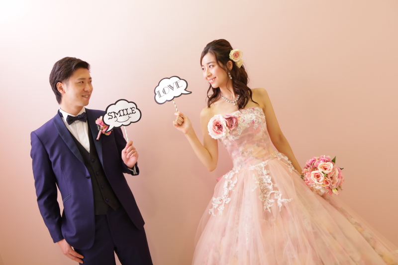 お花でうめつくされた背景や、ピンクの壁、パステル系の可愛い小物を取り入れるなど、フォトウエディングの現場にはいま女の子らしいスイートさがはずせません。