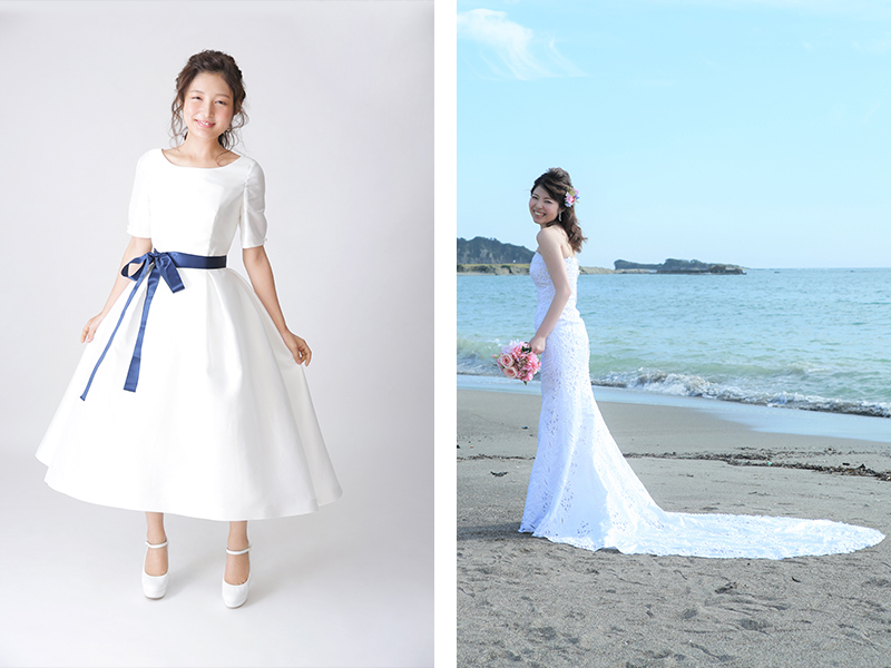 小柄さんにはミモレ丈(ひざ~ふくらはぎの真ん中くらいの丈)がおすすめ!細い足首がチラ見えすることでスタイルアップ効果が期待できてキュートさも手に入ります。森やガーデンでのロケーション撮影を選ぶとフェアリーテイル的な雰囲気を演出。(画像左)