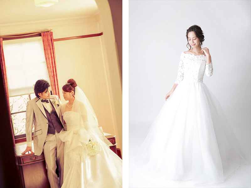 上半身にボリュームが少ない方は、凝ったレース入りなどデザイン性の高い七分袖のドレスがおすすめ。自然なボリューム効果を狙えて、華やかで気品高い雰囲気に。また、上下で素材違いを選べば視覚効果でアクセントをプラスしてくれます。(画像右)