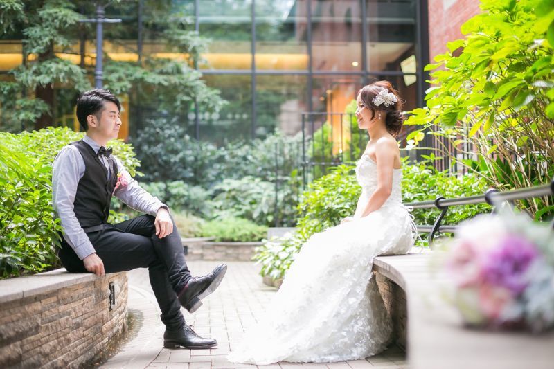 手を取り合ったり、おでこをくっつけたりするポーズだけが前撮りフォトではないのです。初々しい距離感で見つめ合う爽やかな一枚。