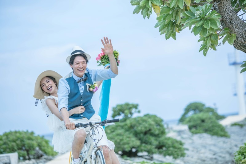 手を振りながら自転車に乗るとこんなにも自然体なふたりのフォトが撮れてしまうんです。スタジオに撮影用の自転車の用意があればリクエストしてみて!
