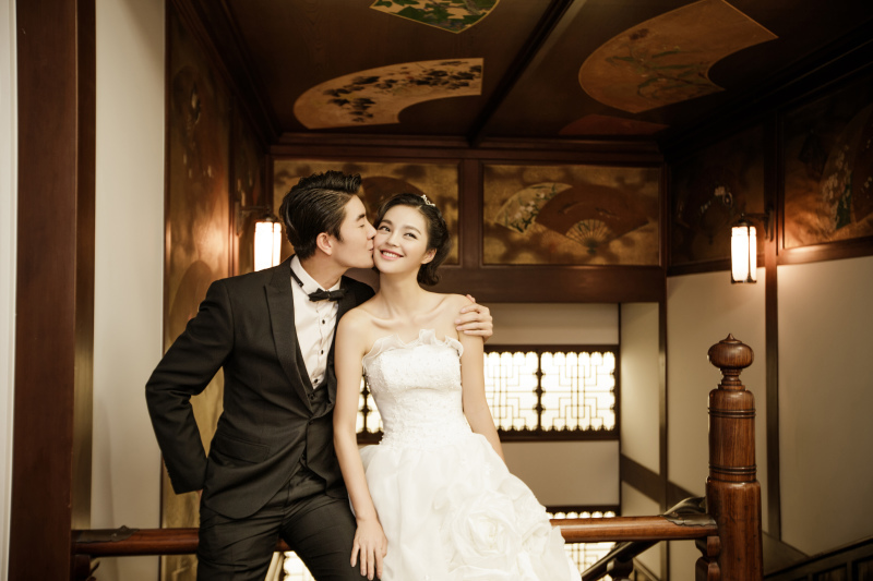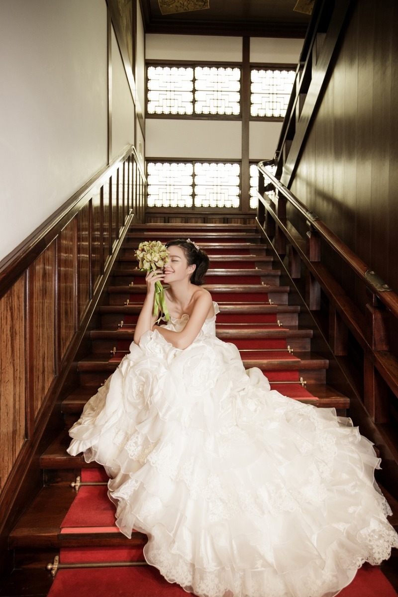 洋装の撮影の場合、和風ロケーションを選択肢から外していませんか?実は洋装と和空間はとっても合うんです!トレーンを後ろに流すバックスタイルは定番ですが、座って裾を斜めに流すのもスタイリッシュでおしゃれ!