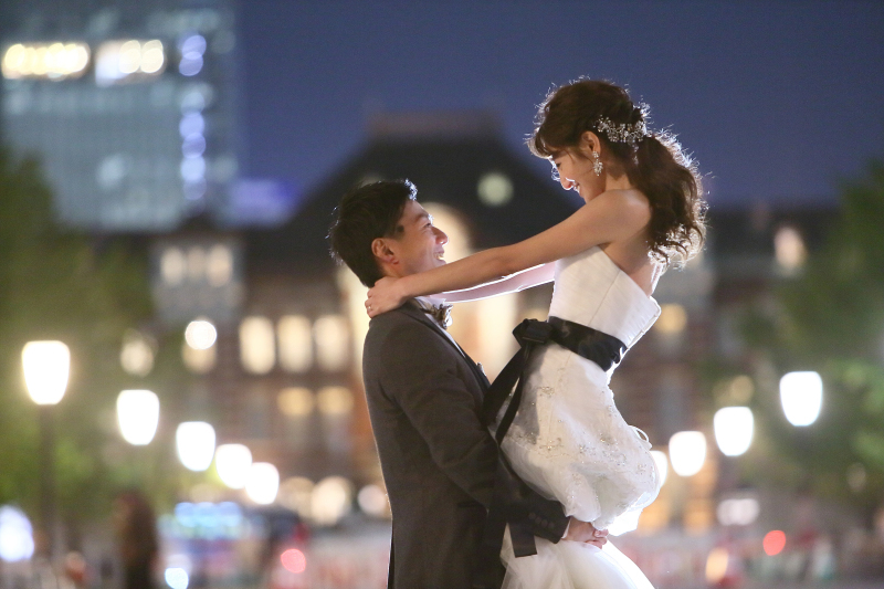 街のイルミネーションに彩られたナイト撮影は一気にロマンチックな雰囲気に。