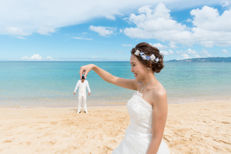 新婦を手のひらに乗せたり、指輪の中に入ったりなど様々なアイディアがある遠近法フォト。どうせやるなら徹底的に!