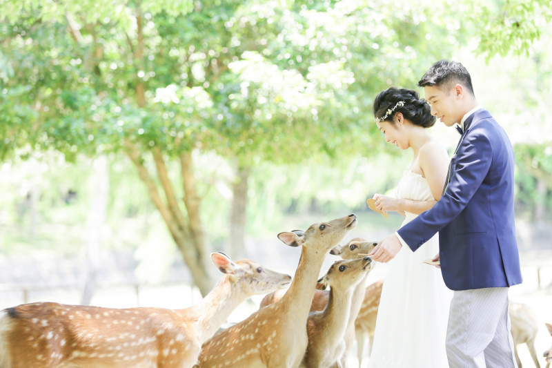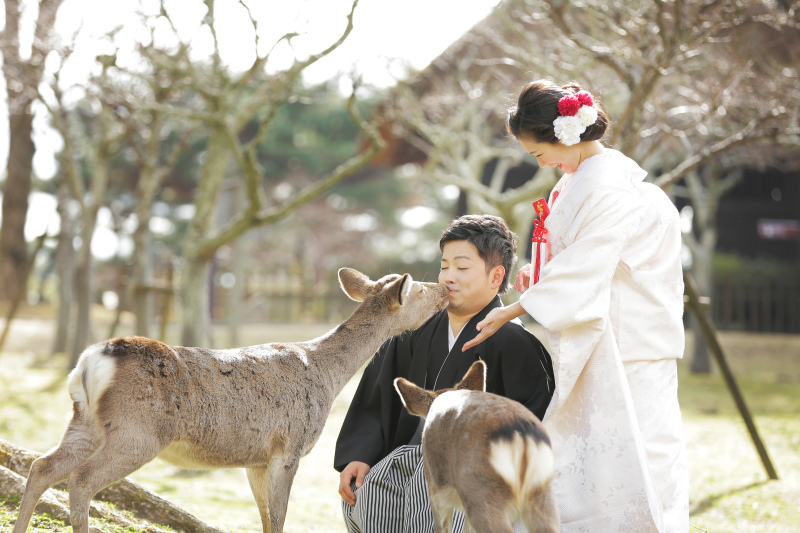 動物と一緒の撮影でおすすめなのが奈良公園。京都よりも空いていて和の歴史を感じる名所も多いので、和装とセットで撮影する場合にも最適!