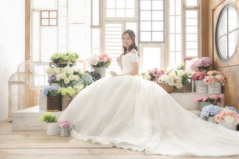 ふんわりスカートに長いトレーンのプリンセスラインを着るなら、斜めに座るこんなポーズがおすすめ。立ち姿よりもボリューム感が出て小顔効果はもちろん、可憐でかわいい印象に。お花に囲まれたスタジオとの相性もぴったり!