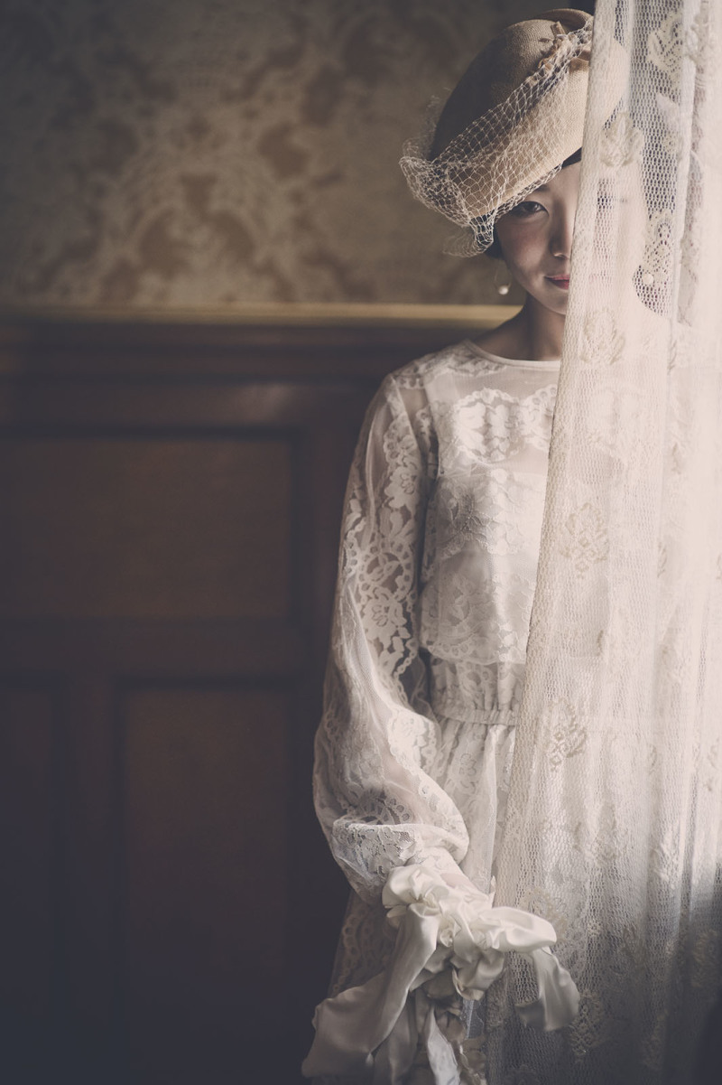おしゃれ花嫁に支持されるレトロモダンな前撮りフォト。帽子や総レースのドレスが貴婦人のようにレディな印象に仕上げてくれる。