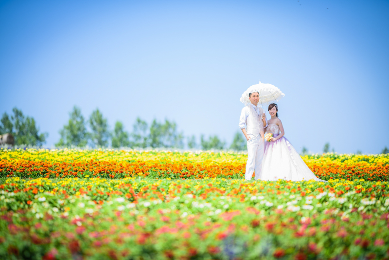 美しい大自然と色とりどりのお花に囲まれたロマンチックなフォトがどの季節でも撮影出来るのも北海道フォトウエディング・前撮りの魅力です。