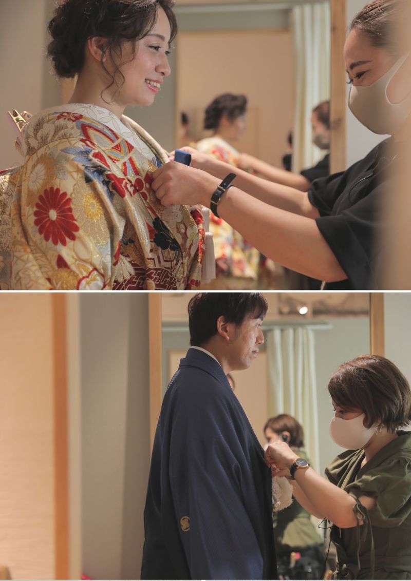 まずは、ご新婦が少し早めにスタジオに到着し、お支度がスタート。ドレスは前もって試着をして、お直しをオーダーしていましたが、和装は当日選ぶことに。