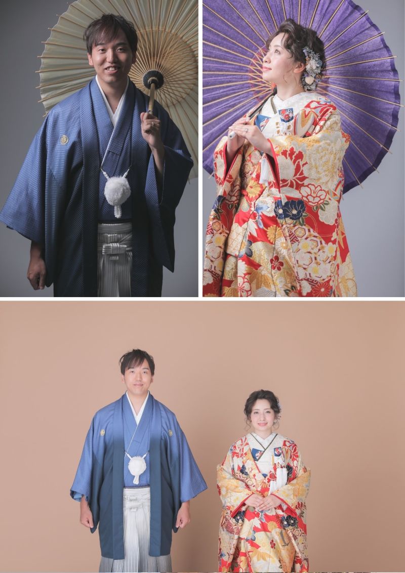無事に挙式を済ませ、緊張もほぐれた和やかな雰囲気の中、背景を変えて洋装撮影。和装も含め、1つのスタジオ内で様々な雰囲気の背景で写真が残せるのも魅力です。