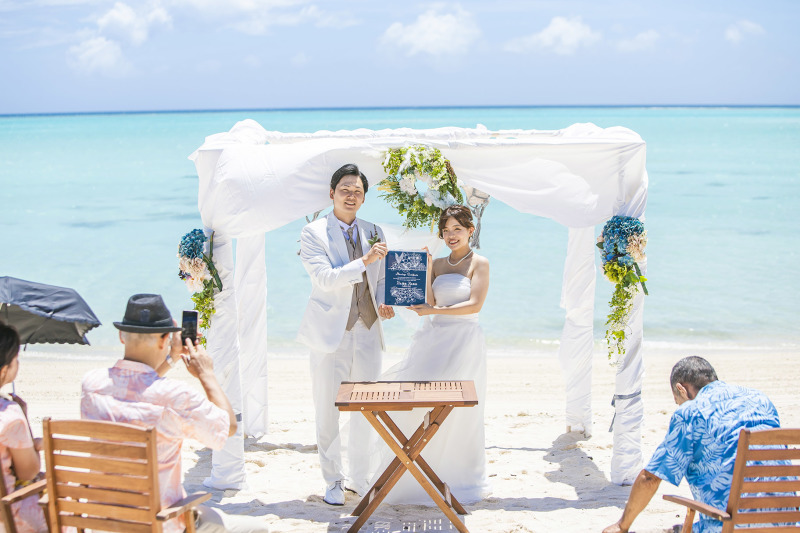 ビーチに設えられたナチュラル&おしゃれなガゼボで、笑顔溢れる人前式が叶います。進行はスタッフにお任せを。