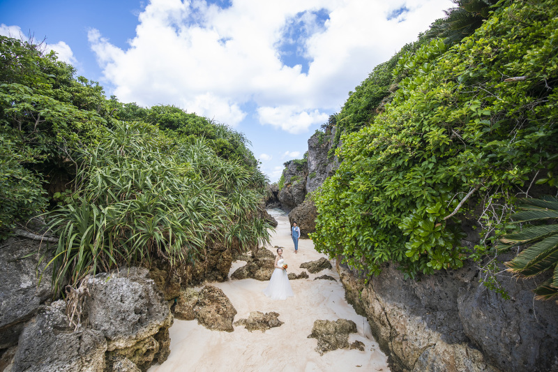 百合が浜と同じく、潮が引いた時だけに現れる幻の小道。そこを進むと大自然溢れる美景が広がり、ビーチ、緑、崖…と表情を変えた撮影が叶います。