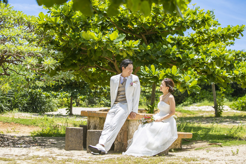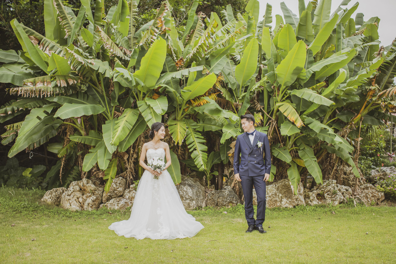 2007年公開の映画「めがね」のロケ地として知られ、多くのファンが聖地巡礼に訪れるヨロン島ビレッジ。緑豊かな芝生、バナナの大木やシンボルツリーなど、海外っぽさ満載で写真映え◎!マーブルリゾートウェディング沖縄だからこそ撮れる特別なスポットです。