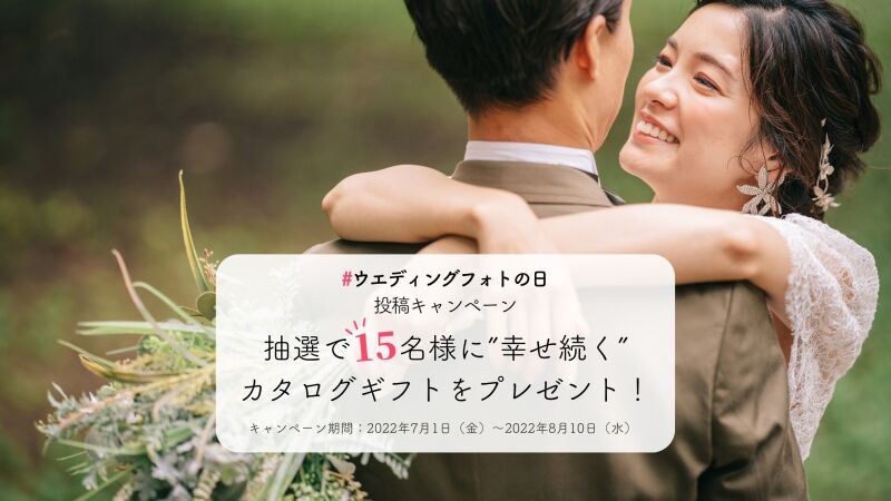 8月10日の「ウエディングフォトの日」制定を記念して、「#ウエディングフォトの日」投稿キャンペーンがスタート!Instagramでウエディングフォトと撮影した当時の思い出やエピソードなどをフィード投稿すると、抽選で“幸せが続く”カタログギフトが当たります!皆さまのご応募をお待ちしています!