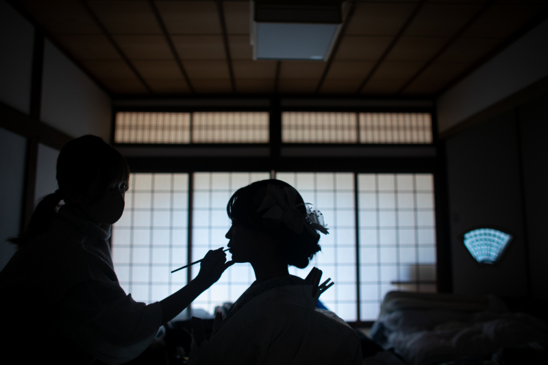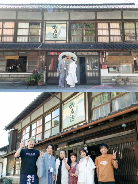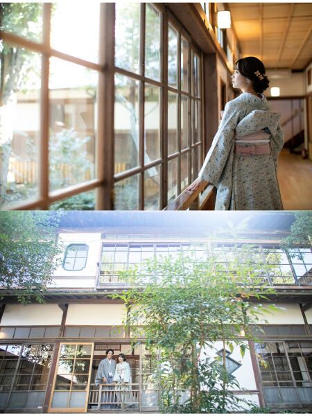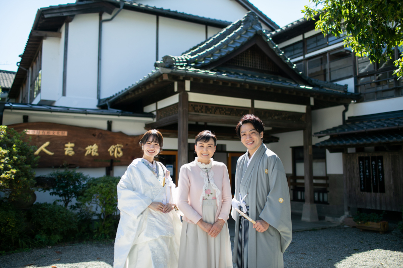 明治時代から続く「芳野旅館」に移動し、洋装のお支度を。雰囲気のある建物とシックな洋装の組み合わせは、おふたりとも「芳野旅館さん、よかった……」と印象に残ったようです。