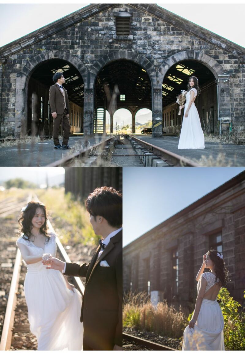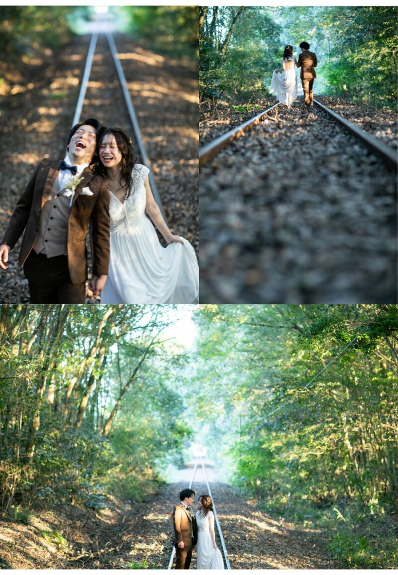 夕日が差し込んできた時間帯に、今度は「くま川鉄道」の線路へ移動。映画のような幻想的なカットが撮れました!まるで、ふたりがこれから歩いていく道を祝しているような……♡
