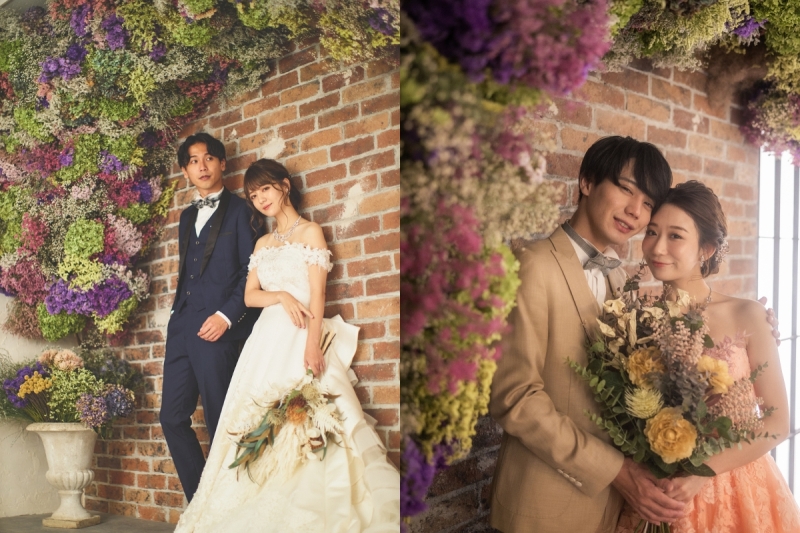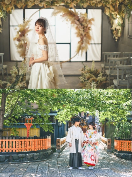 古き良き風情ある京都のロケーション撮影に加え、今回ご紹介した「チャペル風スタジオ」や「フラワーウォール」での室内撮影など様々なシチュエーションでの撮影が可能。カップルの希望に沿った写真が撮れるよう、経験豊富なプロの目線で打ち合わせ〜撮影まで丁寧な対応をしてくれます。遠方在住のカップルであっても来店なしでの打ち合わせができるので、京都への新婚旅行を兼ねたフォトウエディングツアーも叶います。