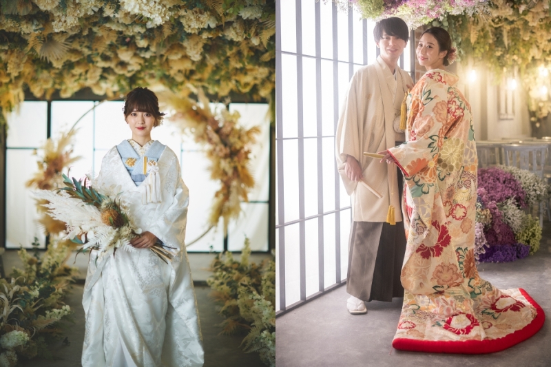 和装、洋装のどちらでもしっくりと馴染むのが、ハルウェディングの新スタジオ。チャペル風と聞くと洋装に偏る印象があるけれど、こちらのスタジオは和でも洋でもフォトジェニックに仕上がるように計算され尽くされているのが大きな特長です。