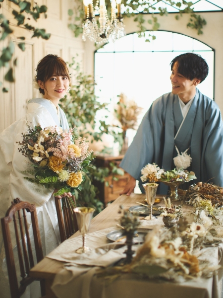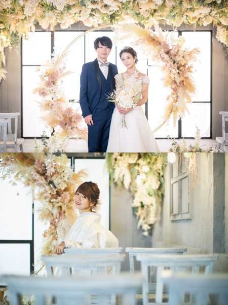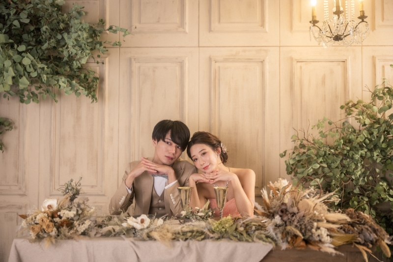 ドライフラワーの装花がふんだんに盛られたおしゃれなテーブル前にふたりが揃えば、キモチ高まる披露宴会場のシチュエーションが完成!リラックスして肩を寄せ合ったり、おしゃべりしてみたり、卓上のグラスに手を添えてみたり。披露宴ナシを選択したカップルにも嬉しい、ウエディングパーティ風のメモリアルフォトを撮れるスポットです。