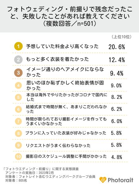 約500名の先輩カップルにアンケート調査を実施しました。先輩カップルの失敗談を分析すると、上位10個を見ても、料金、衣装・ヘアメイク・表情、スケジュール・事前準備などいくつかのポイントで後悔しているカップルが多いことが分かりました。