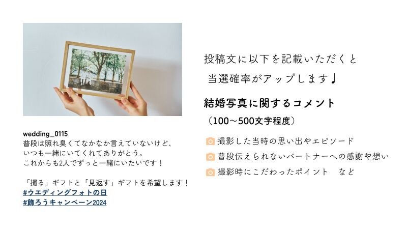 Instagramで 「#ウエディングフォトの日」「#飾ろうキャンペーン2024」のふたつをつけてお家に飾っているor飾ってみたいと思うご自身の結婚写真(フォトウエディング・結婚式など)をフィードに投稿すると、30名様に幸せが続く豪華ギフトが当たります!