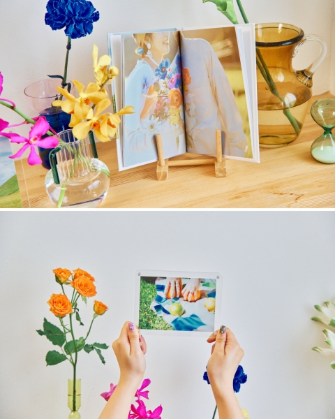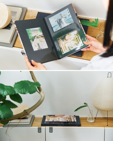 ①アートブック数冊と一緒に、ふたりのアルバムを重ねてコントラストを出す!