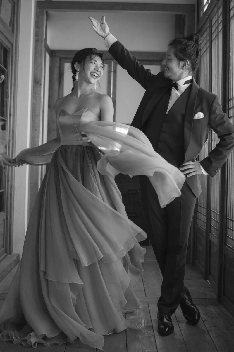 日本のウェディングフォトでは、記念撮影のような印象が強いですが、韓国ウェディングフォトでは、映画のワンシーンを切り取ったようなドラマチックな写真を残すのが特徴の1つです。