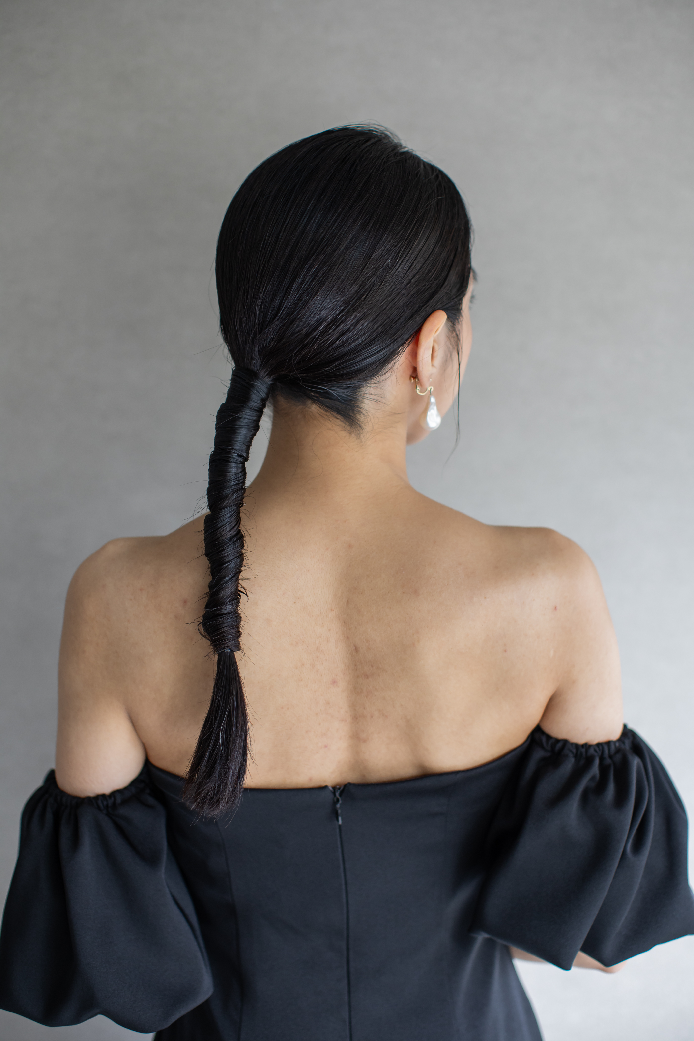 あえてのタイトなシニヨンで背中の美しさを最大限に活かす